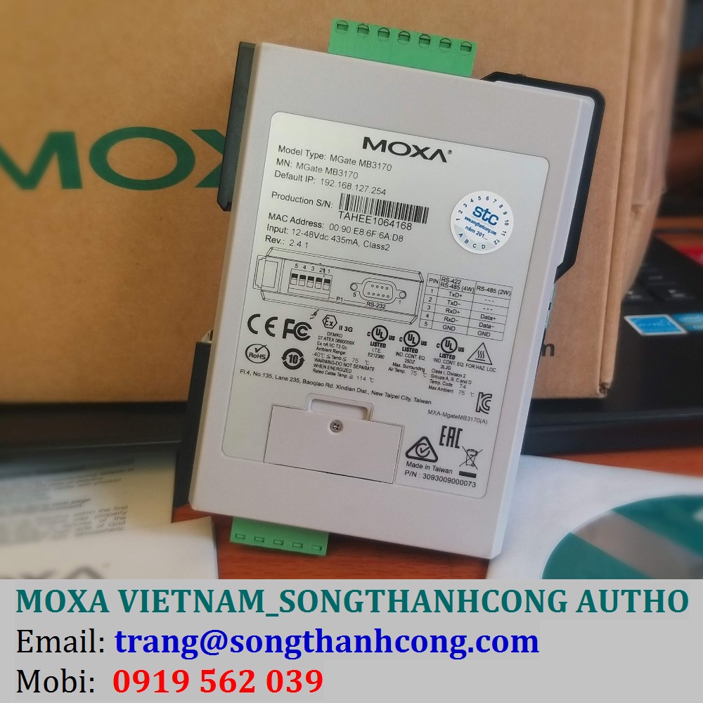 Moxa Vietnam, STC Vietnam Autho, Song Thành Công Đại Lý | Bộ chuyển đổi tín hiệu RS-232/422/485 sang Ethernet 1-port advanced Modbus gateway, 0 to 60°C operating temperature Model: MGate MB3170 |